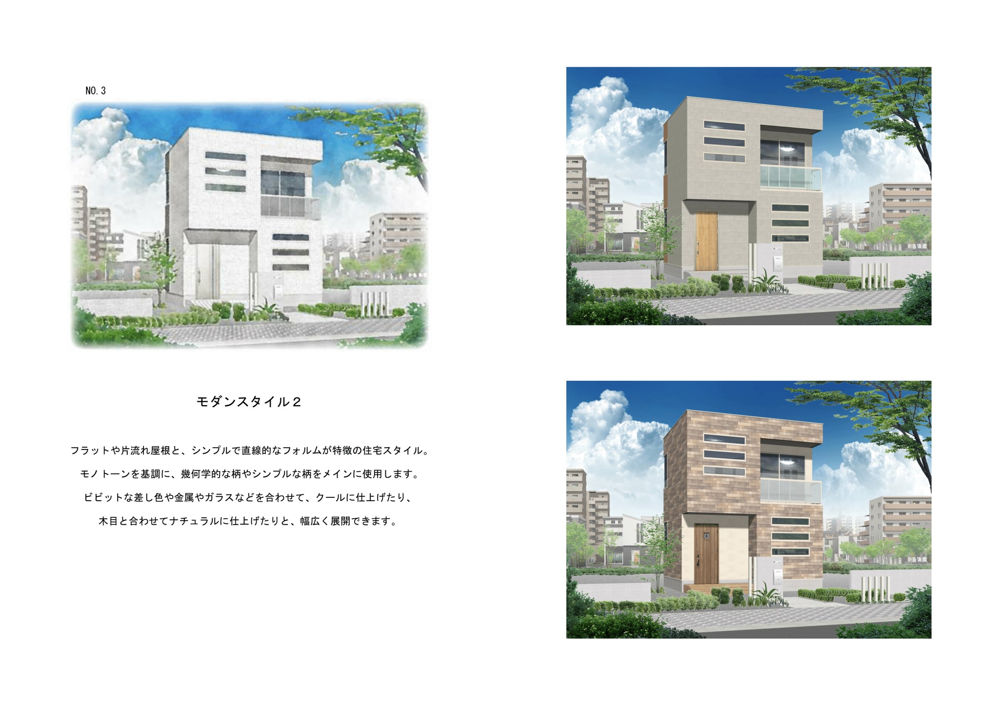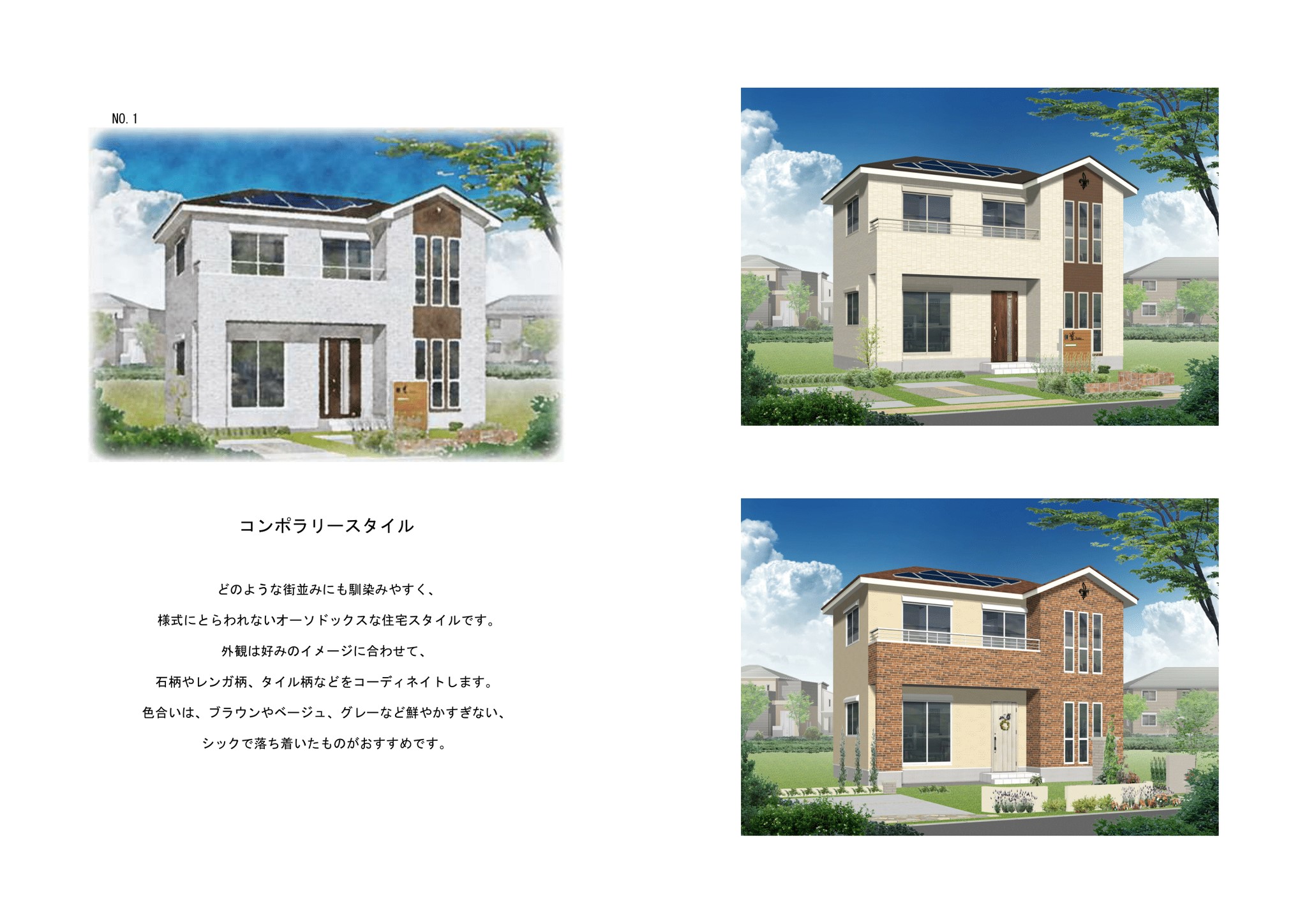 どのような街並みにも馴染みやすく、様式にとらわれないオーソドックスな住宅スタイルです。 外観は好みのイメージに合わせて、石柄やレンガ柄、タイル柄などコーディネイトします。 色合いは、ブラウンやベージュ、グレーなど鮮やかすぎない、シックで落ち着いたものがおすすめです。