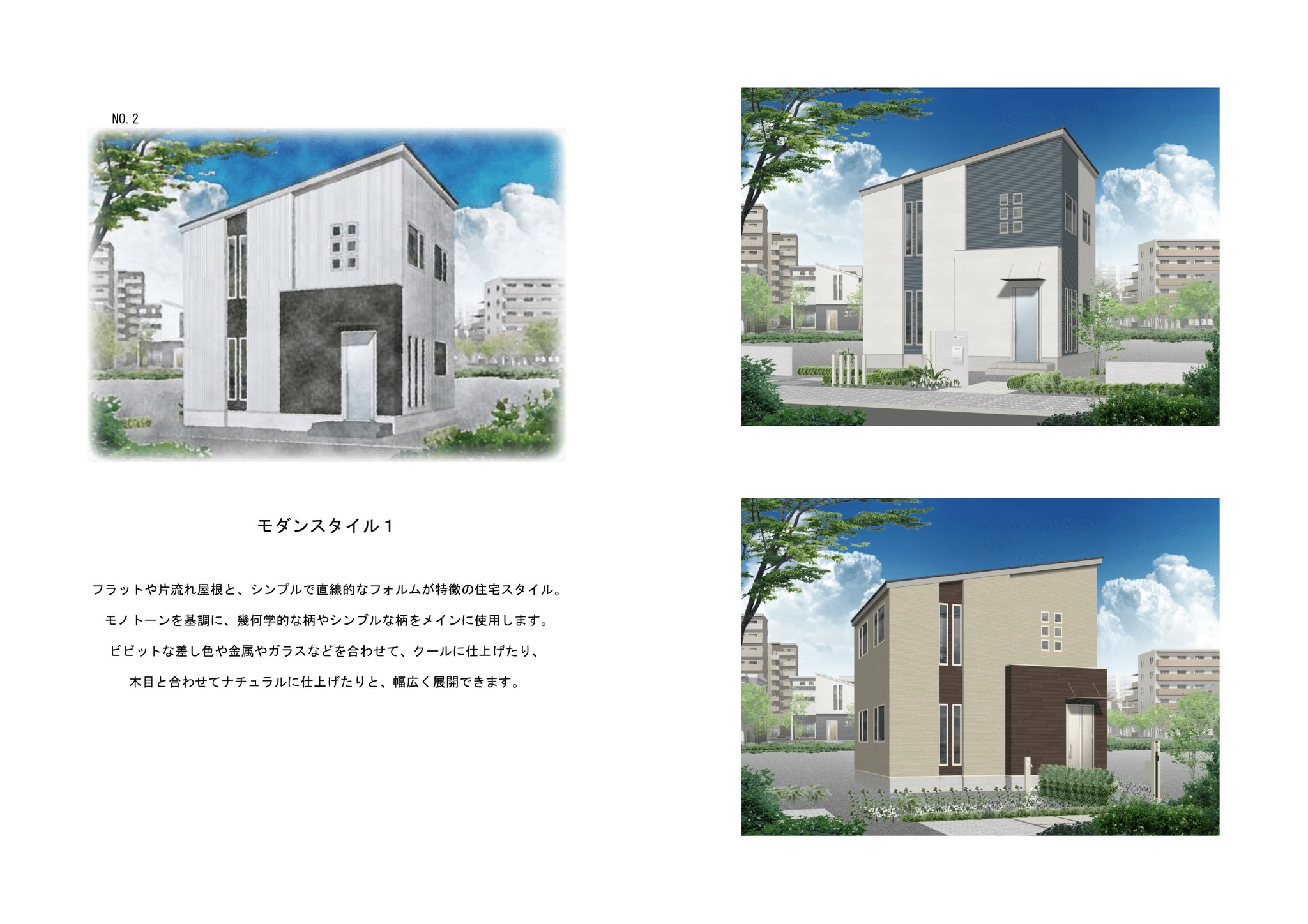 フラットや片流れ屋根と、シンプルで直線的なフォルムが特徴の住宅スタイル。 モノトーンを基調に、幾何学的な柄やシンプルな柄をメインに使用します。 ビビットな差し色や金属やガラス等を合わせて、クールに仕上げたり、木目と合わせてナチュラルに仕上げたりと、幅広く展開できます。