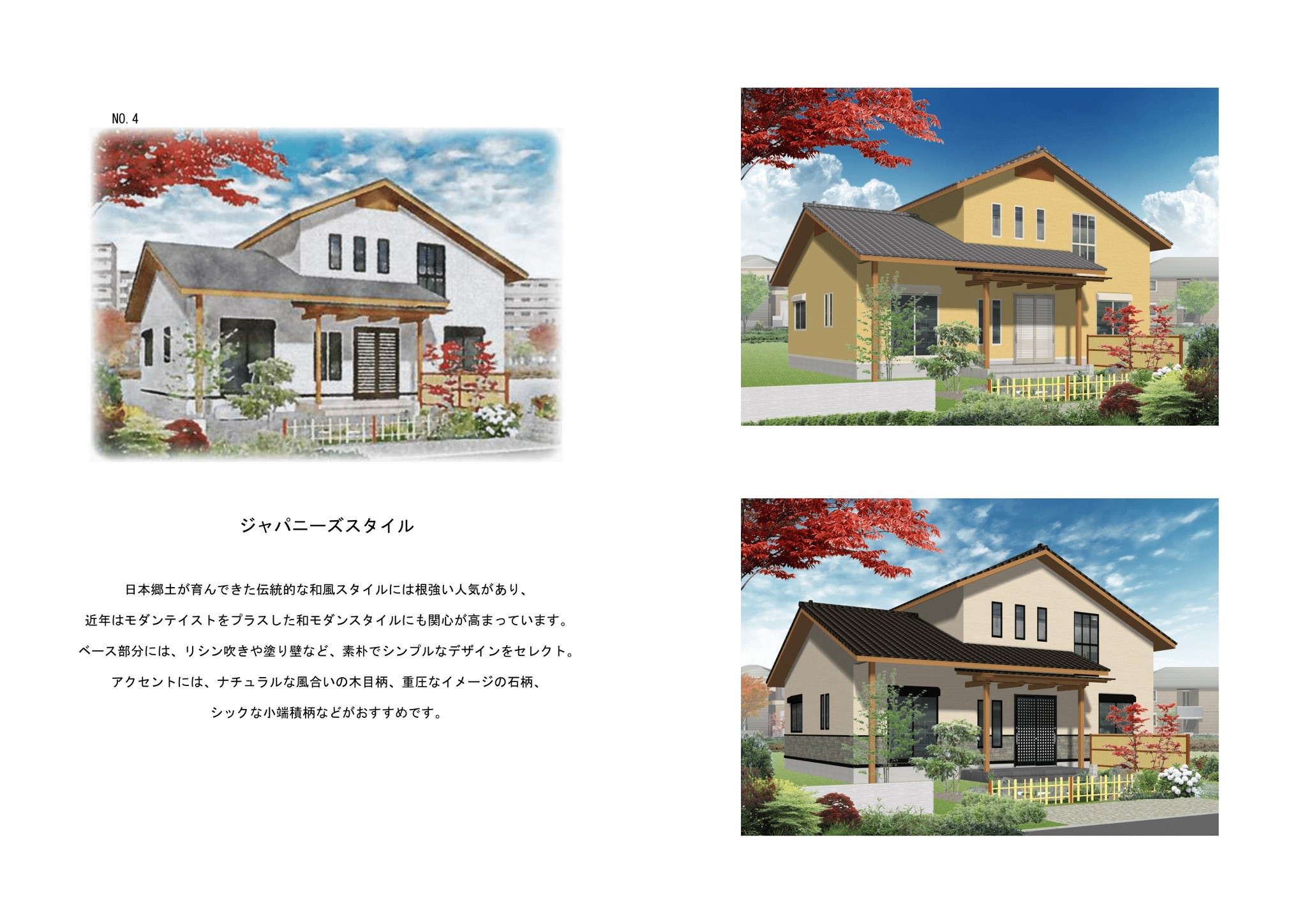 日本郷土が育んできた伝統的な和風スタイルには根強い人気があり、近年はモダンテイストをプラスした和モダンスタイルにも関心が高まっています。 ベース部分には、リシン吹きや塗り壁など、素朴でシンプルなデザインをセレクト。アクセントには、ナチュラルな風合いの木目柄、重圧なイメージの石柄、シックな小端積柄などがおすすめです。