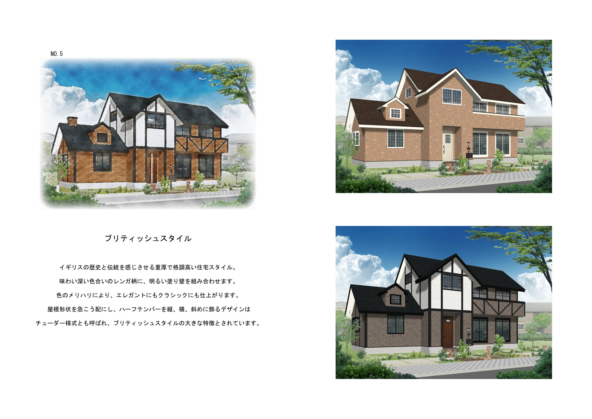 イギリスの歴史と伝統を感じさせる重厚で格調高い住宅スタイル。 味わい深い色合いのレンガ柄に、明るい塗り壁を組み合わせます。色のメリハリにより、エレガントにもクラッシクにも仕上がります。 屋根形状を急こう配にし、ハーフテンバーを縦、横、斜めに飾るデザインはチューダー様式とも呼ばれ、ブリティッシュスタイルの大きな特徴とされています。