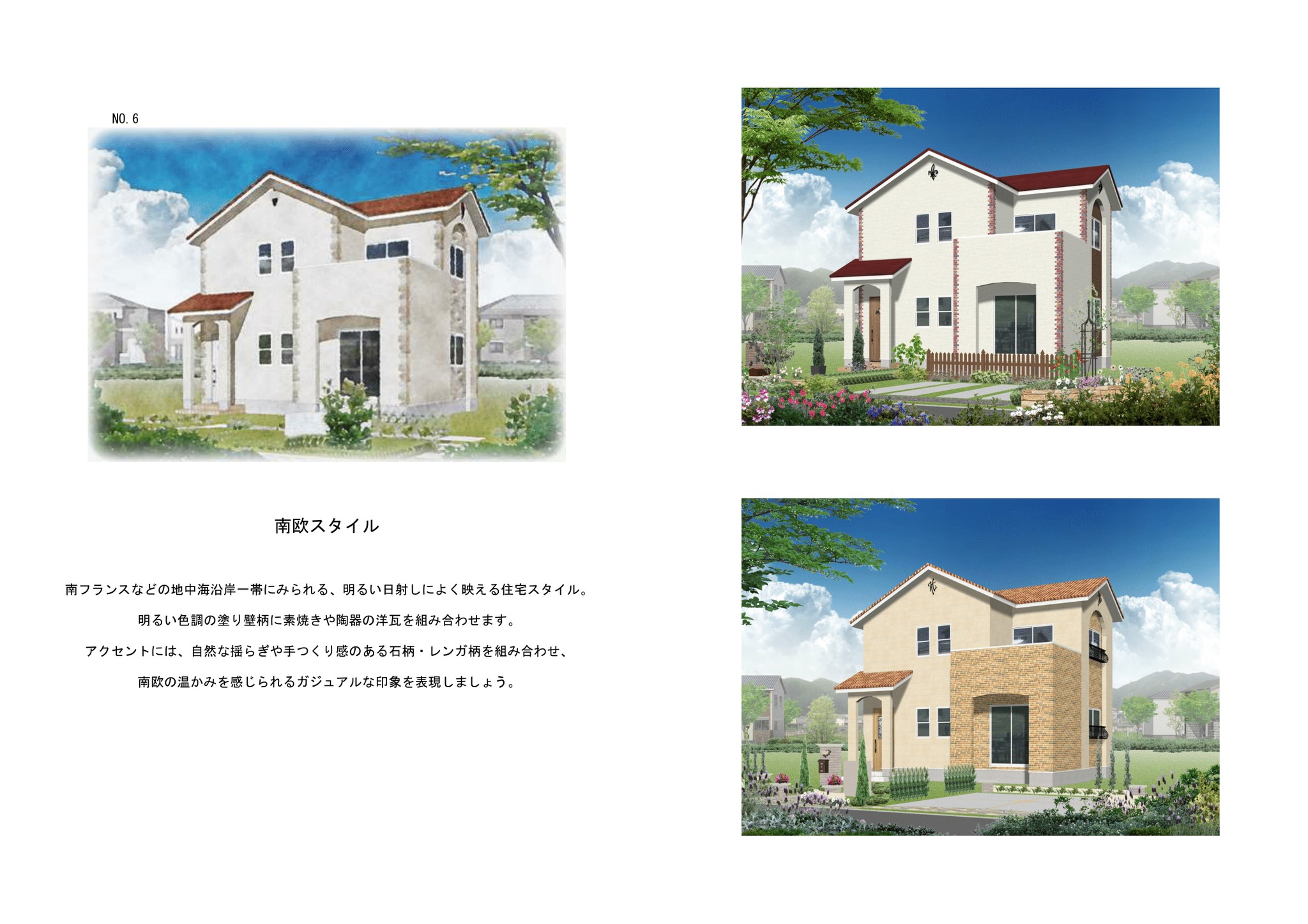 南フランスなど地中海沿岸一帯に見られる、明るい日差しによく映える住宅スタイル。 明るい色調の塗り壁柄に素焼きや陶器の洋瓦を組み合わせます。アクセントには、自然な揺らぎや手つくり感のある石柄、レンガ柄を組み合わせ、南欧の温かみを感じられるカジュアルな印象を表現しましょう。