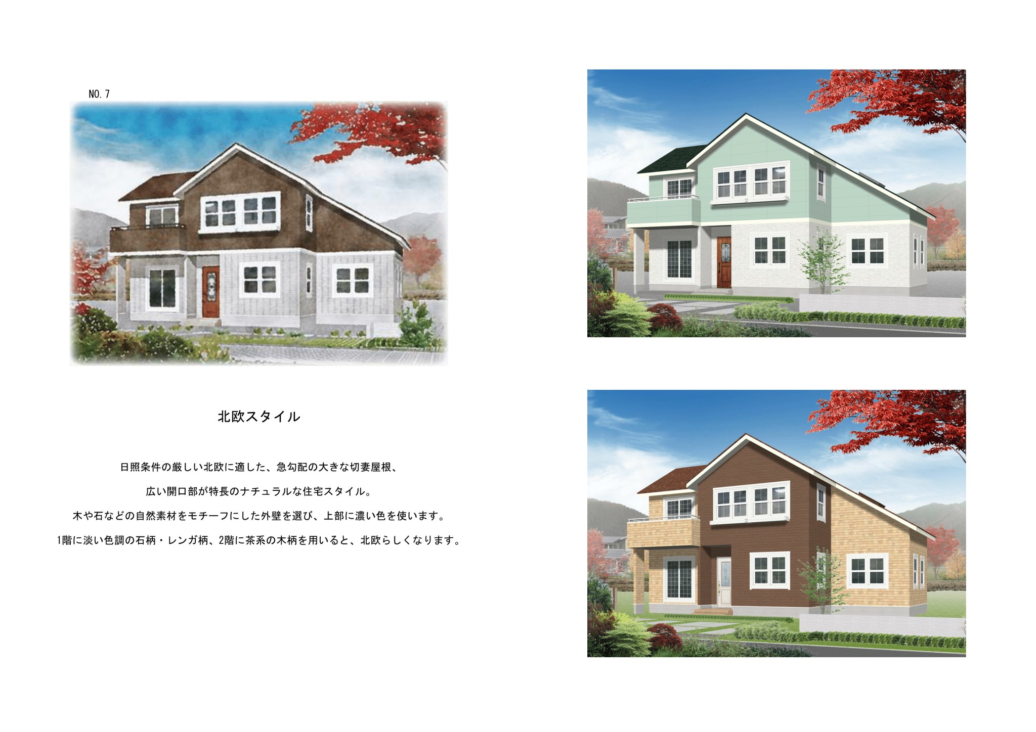 日照条件の厳しい北欧に適した、急勾配の大きな切妻屋根、広い開口部が特徴のナチュラルな住宅スタイル。 木や石などの自然素材をモチーフにした外壁を選び、上部に濃い色を使います。1階に淡い色調の石柄、レンガ柄、2階に茶系の木柄を用いると、北欧らしくなります。